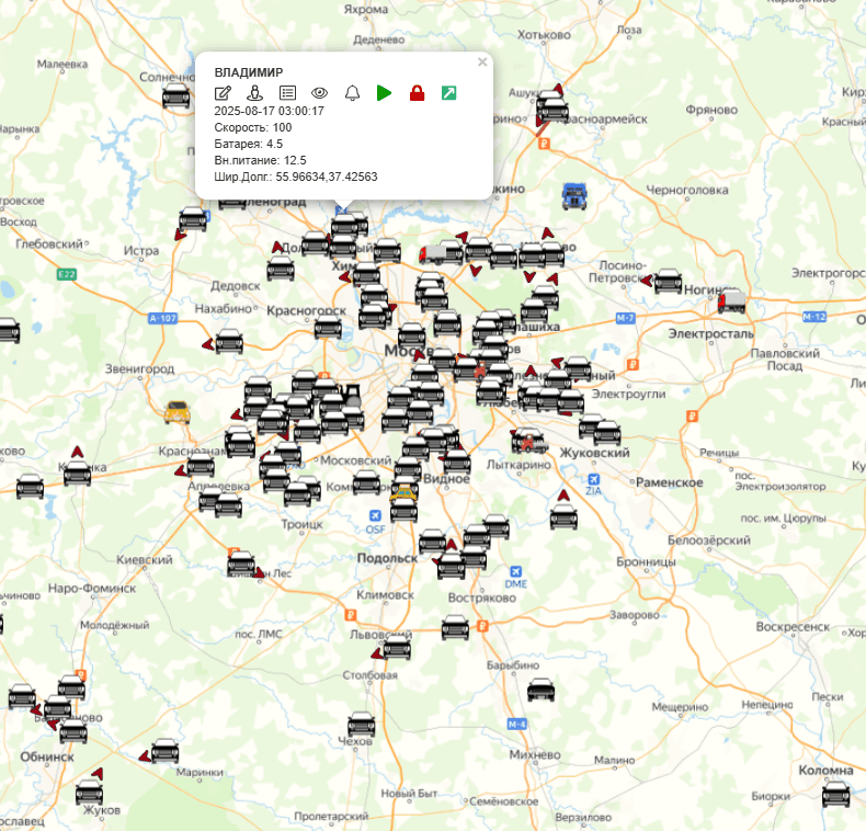 • Зона обслуживания – вся территория РФ/СНГ/Европа; • Без ограничения по количеству пользователей; • Без ограничений по количеству объектов; • Система мониторинга доступна 24/7; • Хранение истории – 500 дней. Цена 900 руб/мес В системе реализован весь необходимый функционал для мониторинга и контроля за ТС, в т.ч. такие функции как: GPS/ГЛОНАСС мониторинг (местоположение, трек, стоянки, скорость, состояние зажигания (вкл/выкл), двигатель (заведен/заглушен), статус блокировки двигателя, если подключена функция); Автоматическая блокировка двигателя при нарушении заданных условий (например, выход из разрешенной зоны, превышение скорости и т.п.) Автоматическую блокировку двигателя можно применить к любому событию; Отправка уведомлений по событиям в Telegram, e-mail; Широкий перечень предустановленных отчетов; Построение графиков по любым параметрам; Ретрансляция данных в РНИС Москвы/МО, ОССИГ, Адвантум и т.п.; Геозоны и POI – количество не ограниченно; Система UniSky интегрирована с Системой управления таксопарком, компании Элемент-автопарк онлайн. Компания Элемент является официальным партнером ЯндексGo; Обучение и консультации по работе системы мониторинга; Контроль температуры в рефрижераторе; Контроль параметров CAN и контроль расхода топлива.